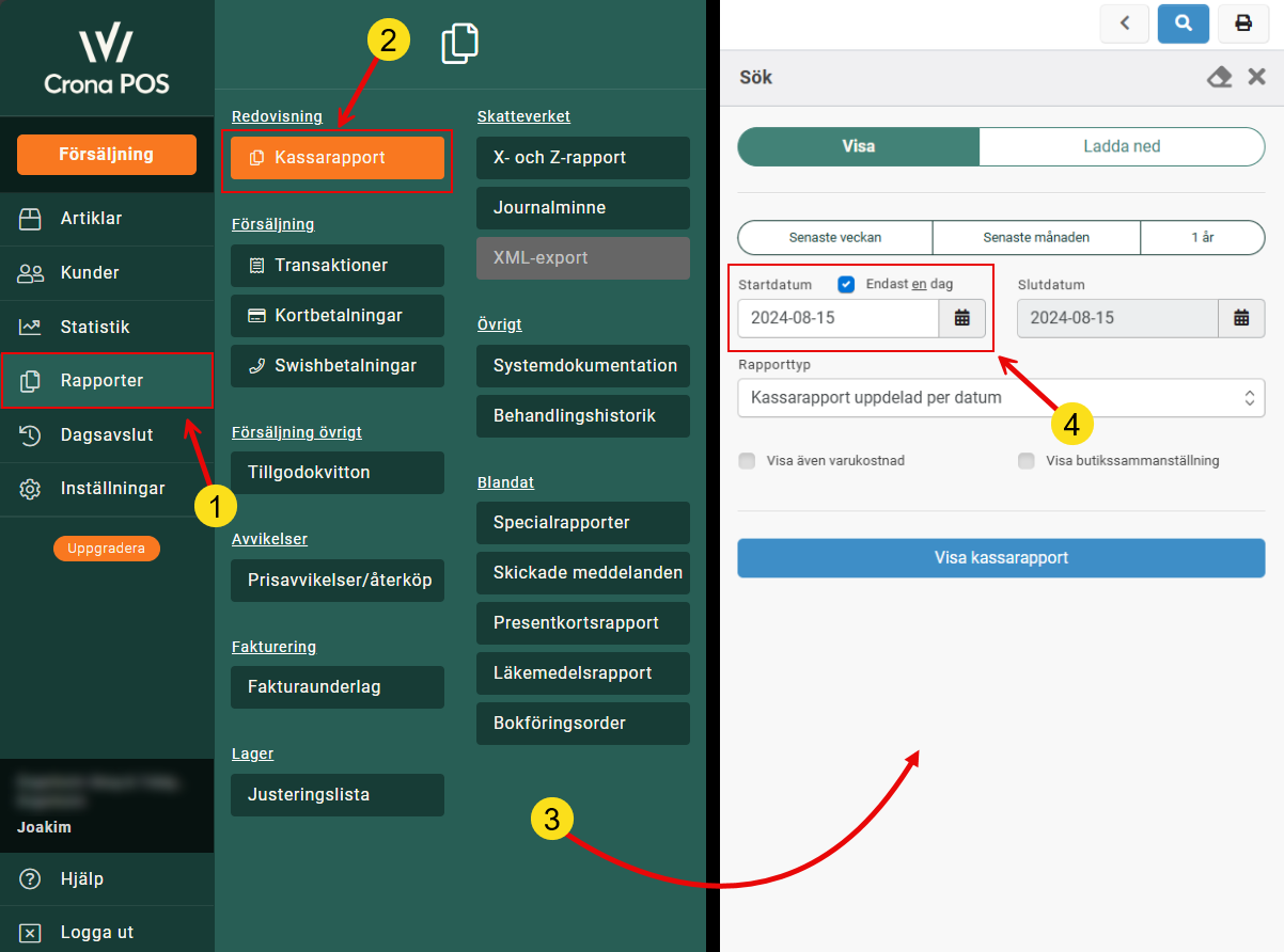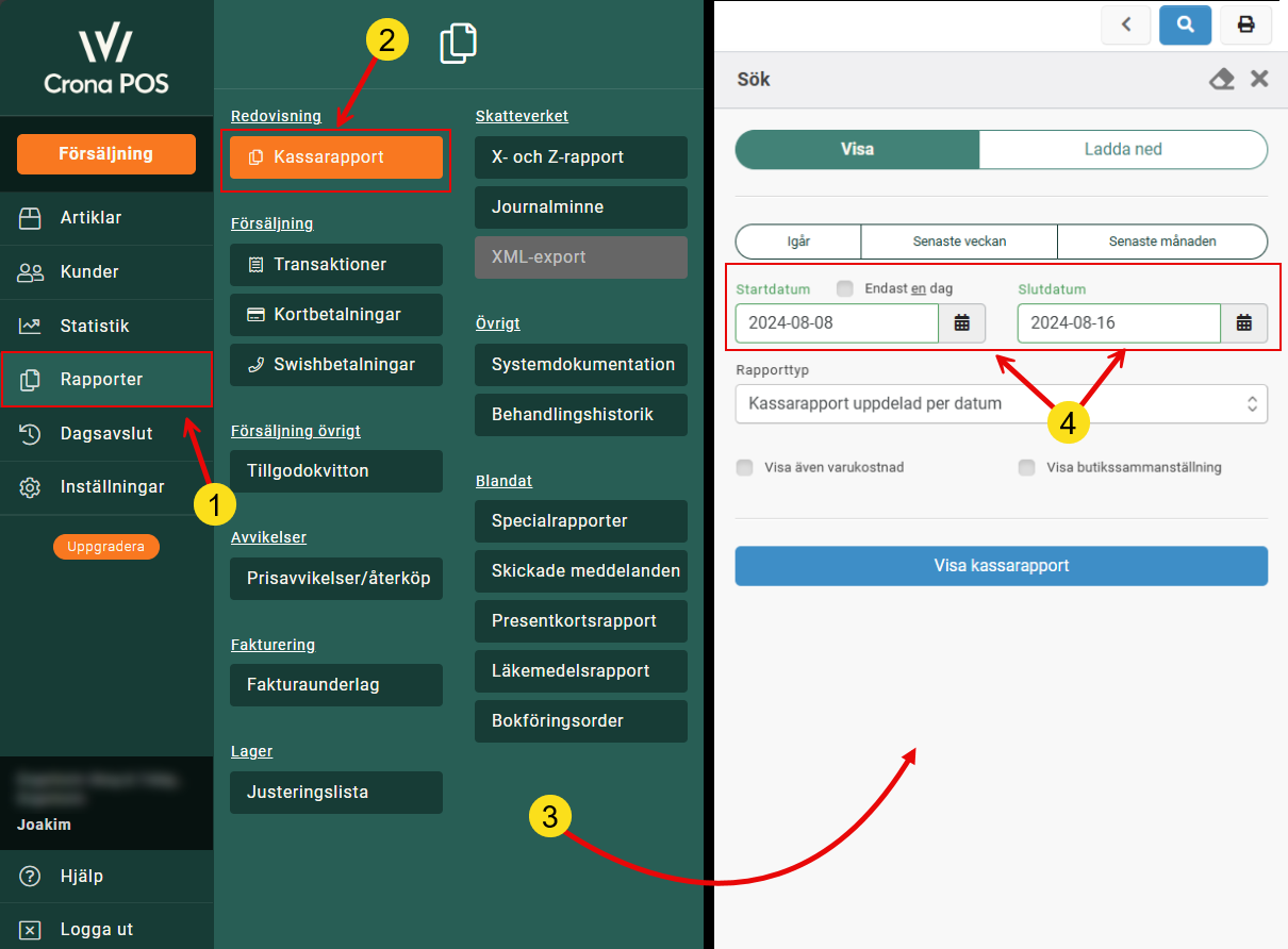 Missade man att göra kassaavräkningen för gårdagen, så kan man enkelt ta ut en kassarapport från Crona POS för endast gårdagen eller en period.